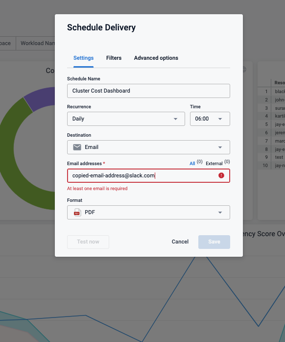 A Dashboard lets you schedule immediate or recurring delivery of dashboards. This topic describes how to schedule and share dashboards to particular slack user or channel.