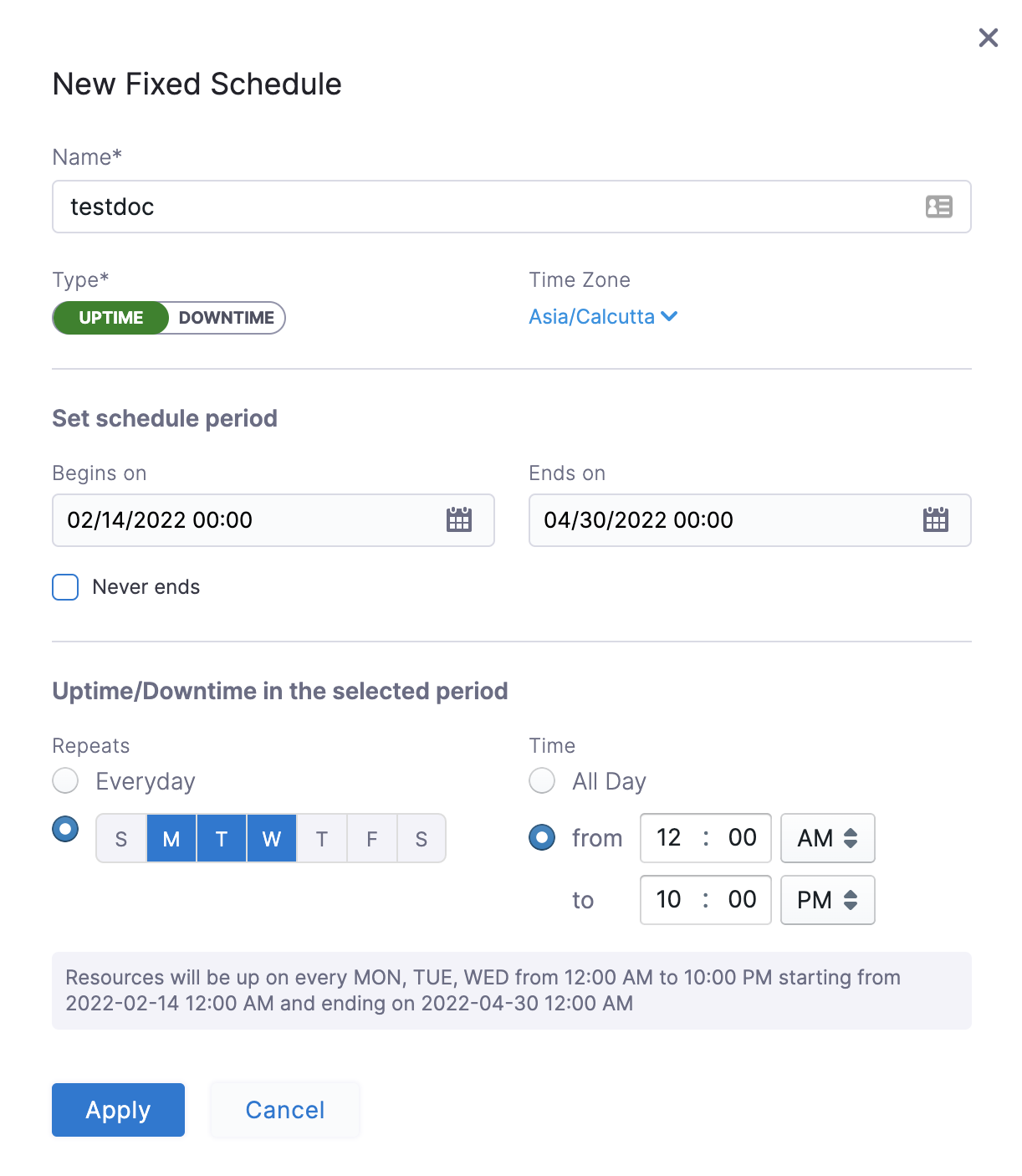 In the following example, resources are up every Mon, Tue, Wed starting from 12:00 a.m. on February 14, 2022 till April 30, at 10:00 p.m.Example 2: