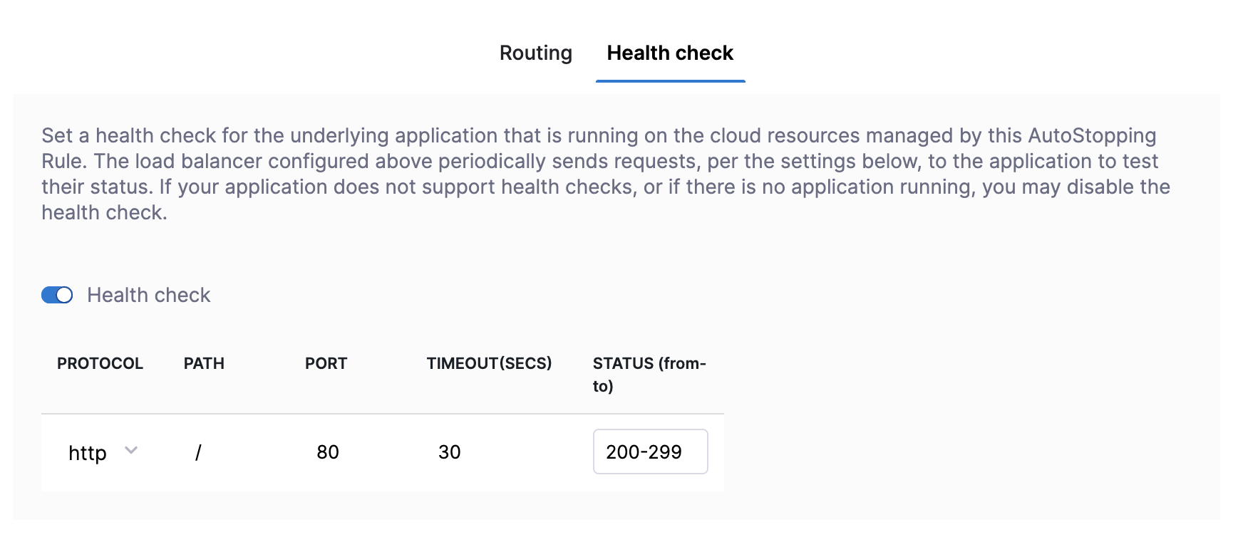 - Toggle the Health check button to configure the health check. Health check status should be successful for the AutoStopping rules to come into effect. Set a health check for the underlying application that is running on the cloud resources managed by this AutoStopping rule. The load balancer periodically sends requests as per the settings below to the application. If your application does not support health check, or you do not have any application running, you can disable the health check.