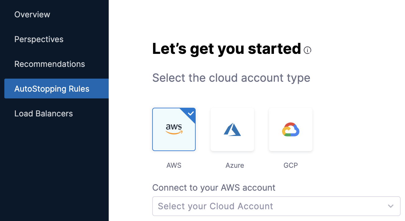 2. In the cloud account type, select your cloud account. For example, AWS. It is the cloud account in which your workloads are running that you want to manage using AutoStopping rules.