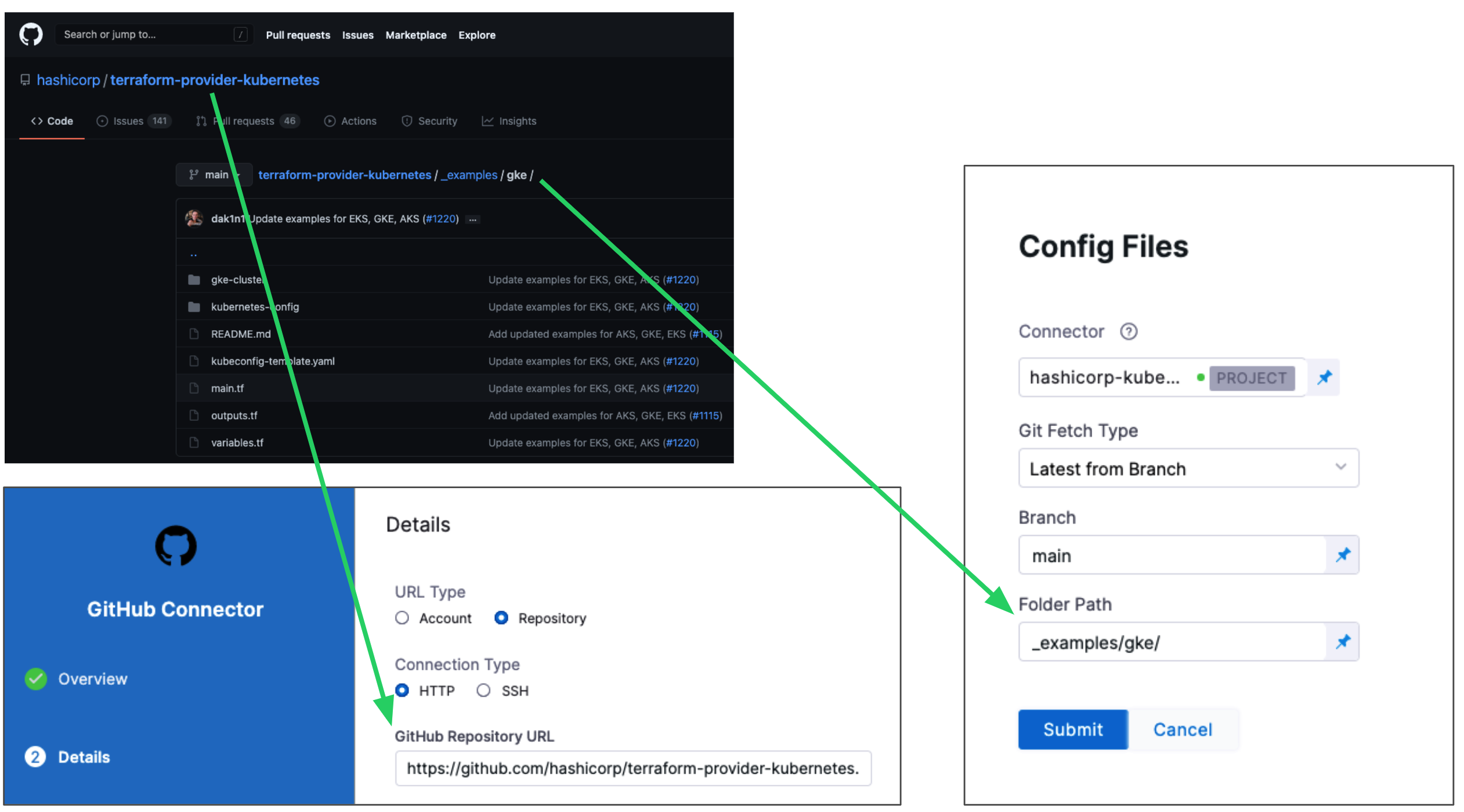 For example, here's a Terraform script repo, the Harness Connector to the repo, and the Config Files settings for the branch and folder path: