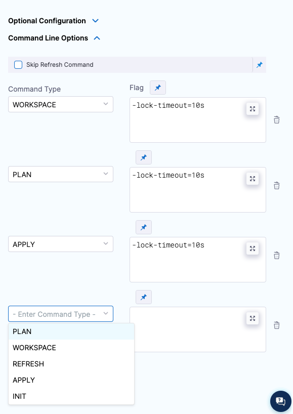 This setting allows you to set the Terraform CLI options for Terraform commands depending on the Terraform step type. For example: -lock=false