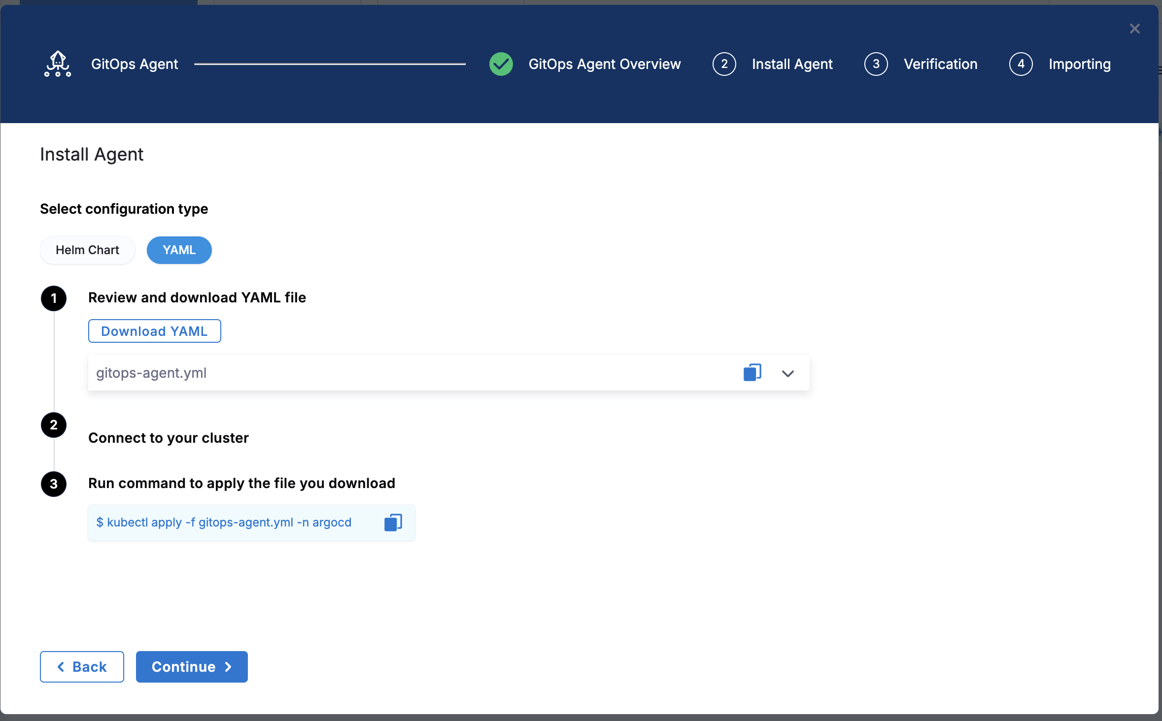 The YAML option lets you download the manifest YAML for the Harness GitOps Agent. You can download this YAML file and run it in your Harness GitOps Agent cluster.