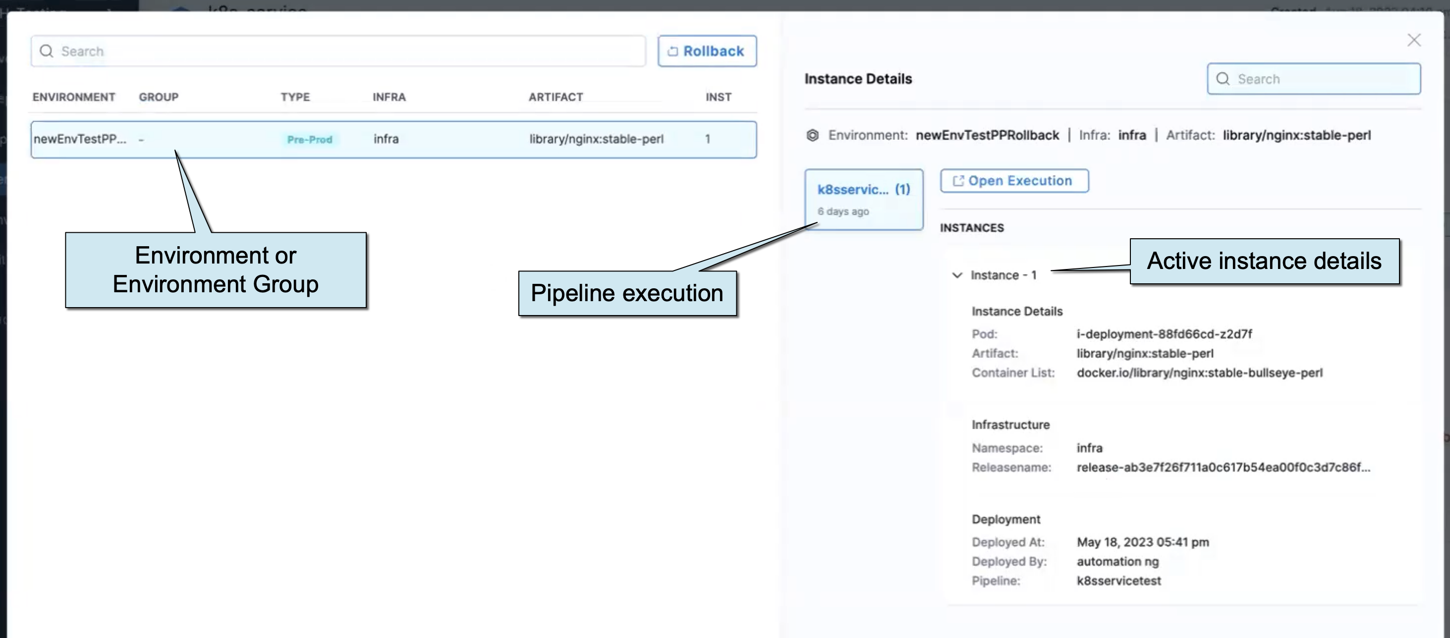 - Clicking the environment opens details for the specific environment where the artifact was deployed.