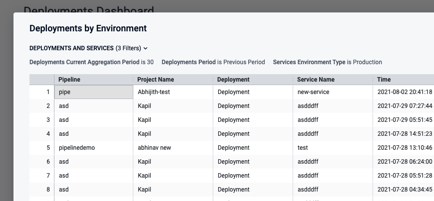Deployments and services can be measured within the CD module (Overview and Services in the Deployments module), and using the Harness Platform Dashboards (Dashboards). Platform Dashboards also let you create highly advanced custom dashboards.