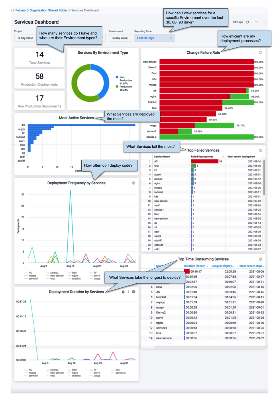 The services dashboard lets you measure the efficiency of your service deployments by Environment and overall.