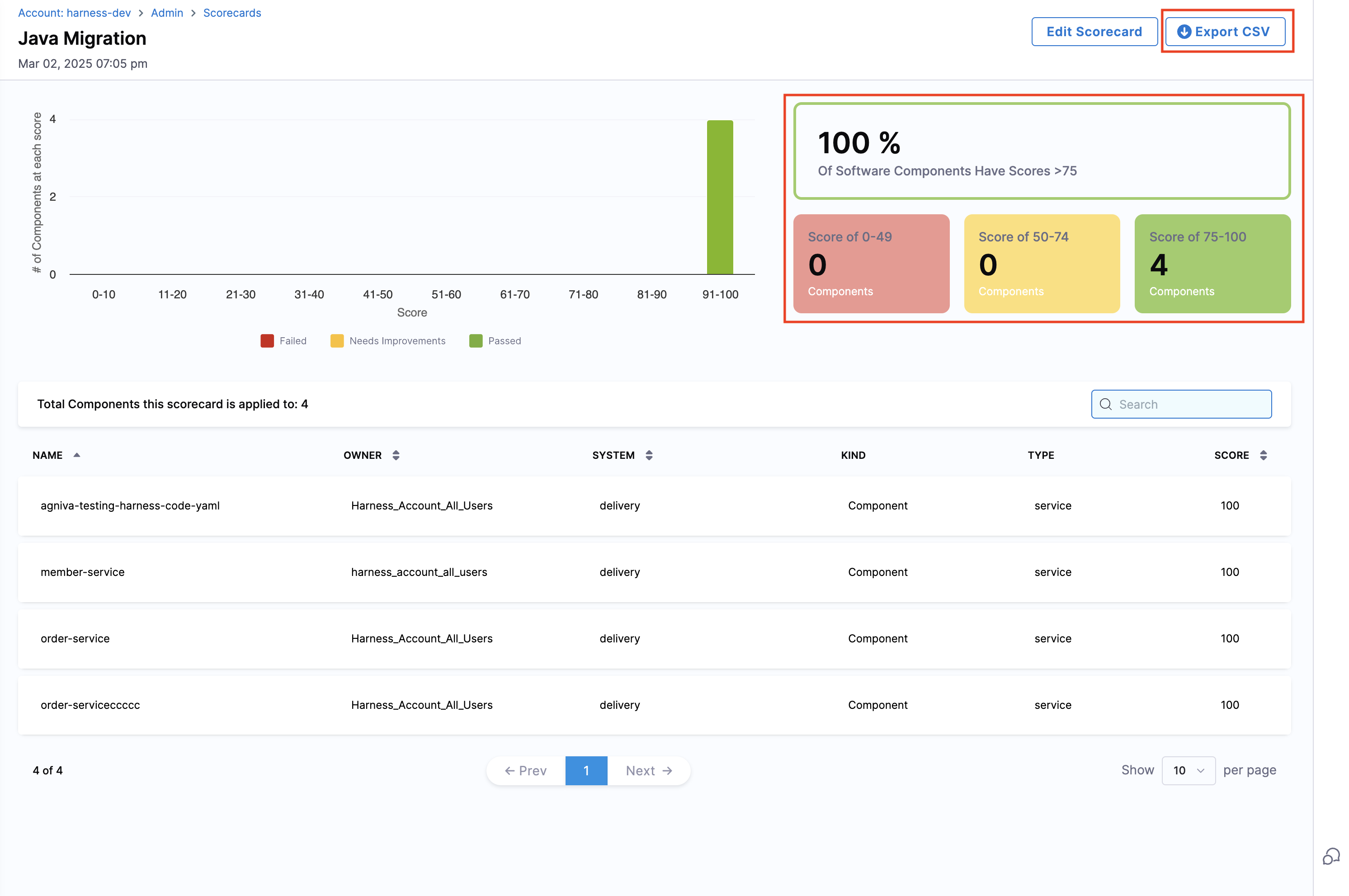 The dashboard will display all components where the Scorecard was executed along with their detailed scores. You can export the aggregate data by clicking "Export CSV" to download it in CSV format.