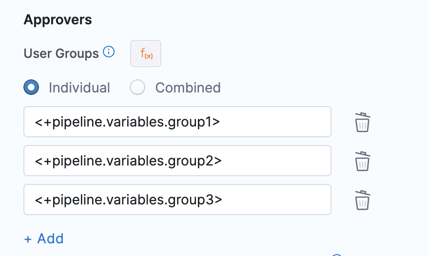 Individual: Specify individual expressions for each user group that needs to be configured as an approver. Select Add to add more user groups.