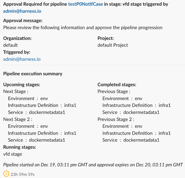 : A notification is sent when the approval step starts containing the pipeline name, execution URL, user who triggered the pipeline, stage name, approval message, organization and project details, pipeline start time, and the time left in approval expiry.