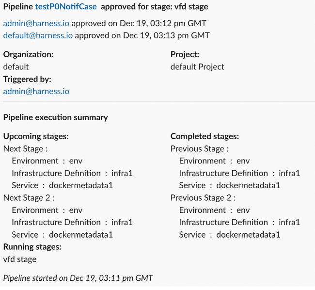 : A notification is sent when the approval step is approved or rejected. The notification contains the pipeline name, execution URL, step status, stage name, the user who triggered the pipeline, organization, and project details, pipeline start time, approval activity details containing approver name, action, and the time of the approval or rejection.