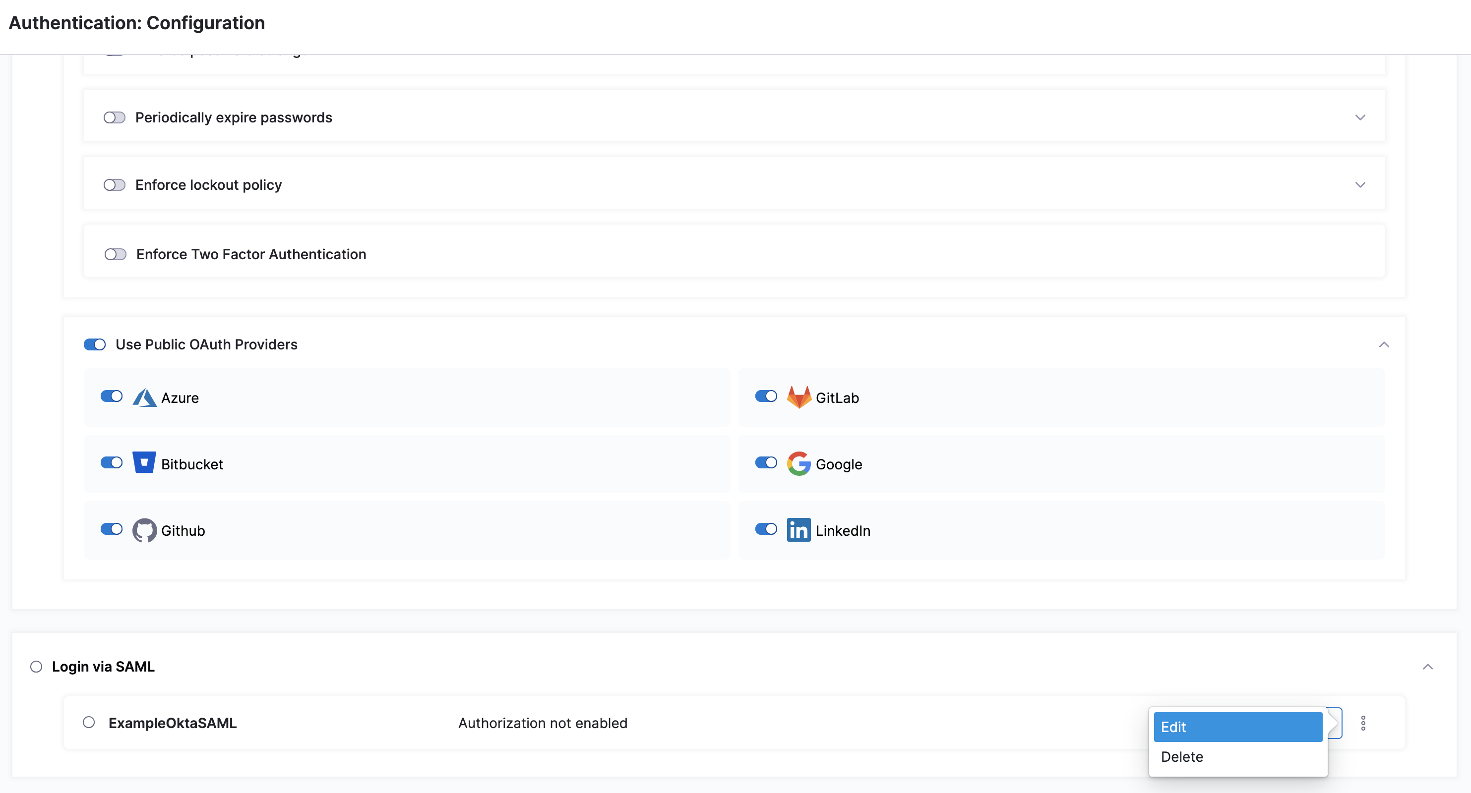You can see the SSO Provider you have set up listed in this section. Click the vertical ellipsis (︙) next to the SSO Provider you have set up for SSO authentication, and click Edit.