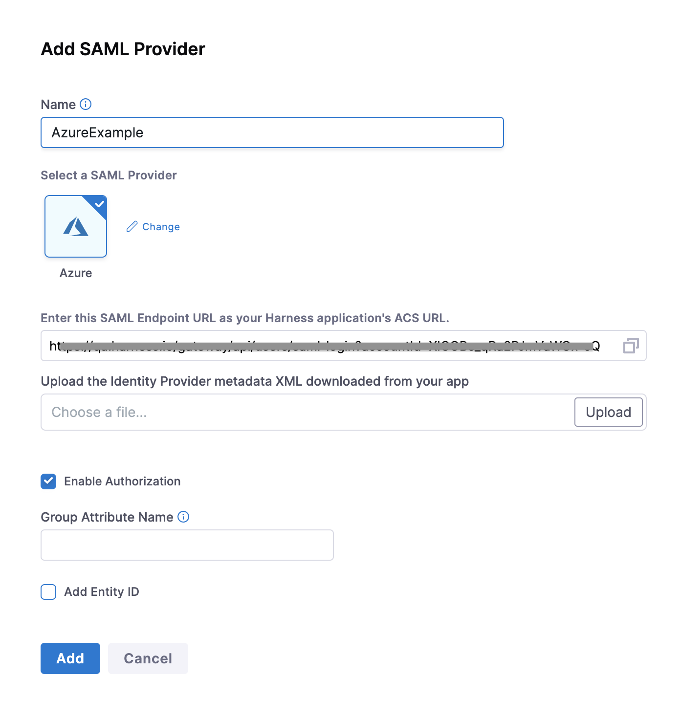 In Harness, on the Add SAML Provider page, in Upload the Identity Provider metadata XML downloaded from your Okta app, select Choose a file or Upload, and select the SAML metadata file you downloaded from your Okta app.