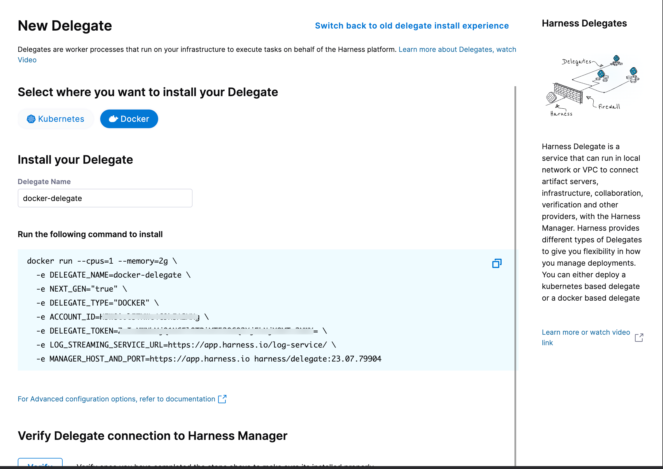 command. For more information, go to Install Harness Delegate on Kubernetes or Docker.