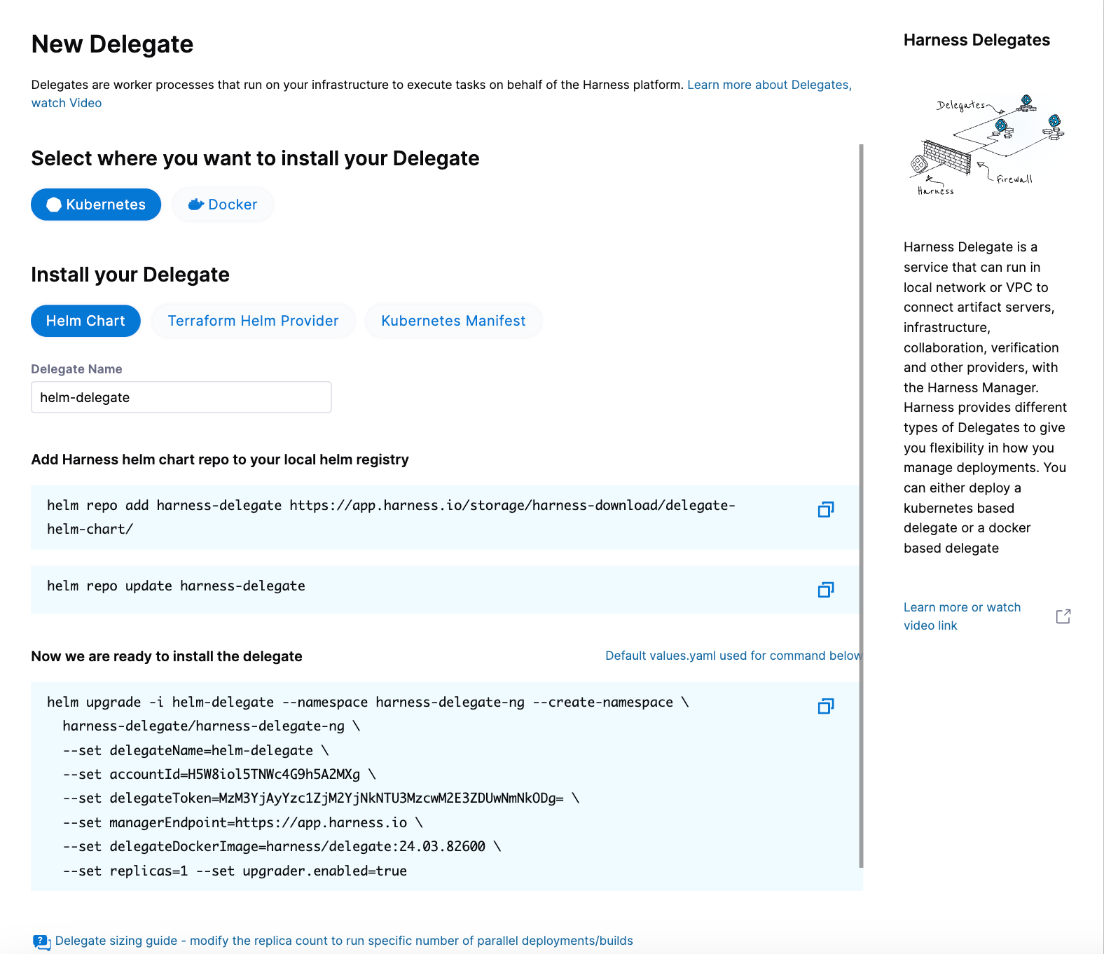 file we created earlier:helm upgrade -i <YOUR-DELEGATE-NAME> --namespace harness-delegate-ng --create-namespace \