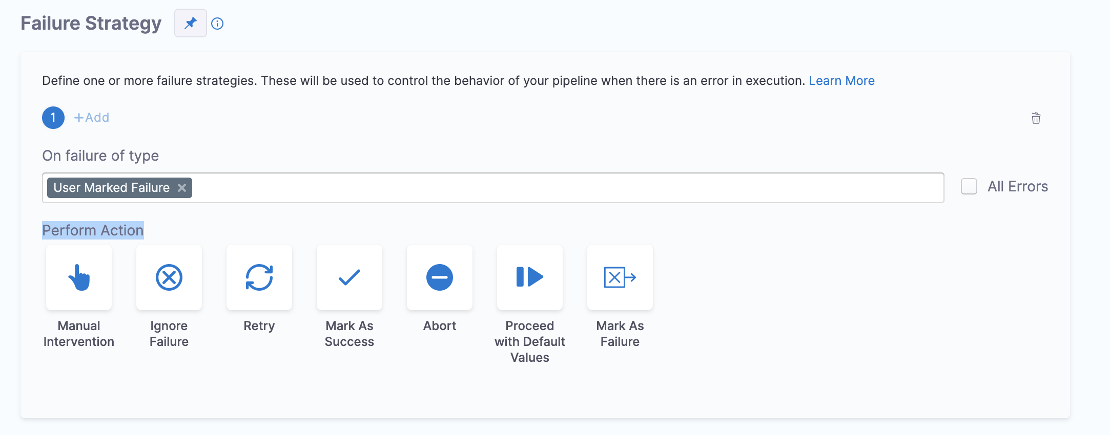 - For Perform Action, select the desired action to take when the stage is marked as failed, such as Rollback or Retry.