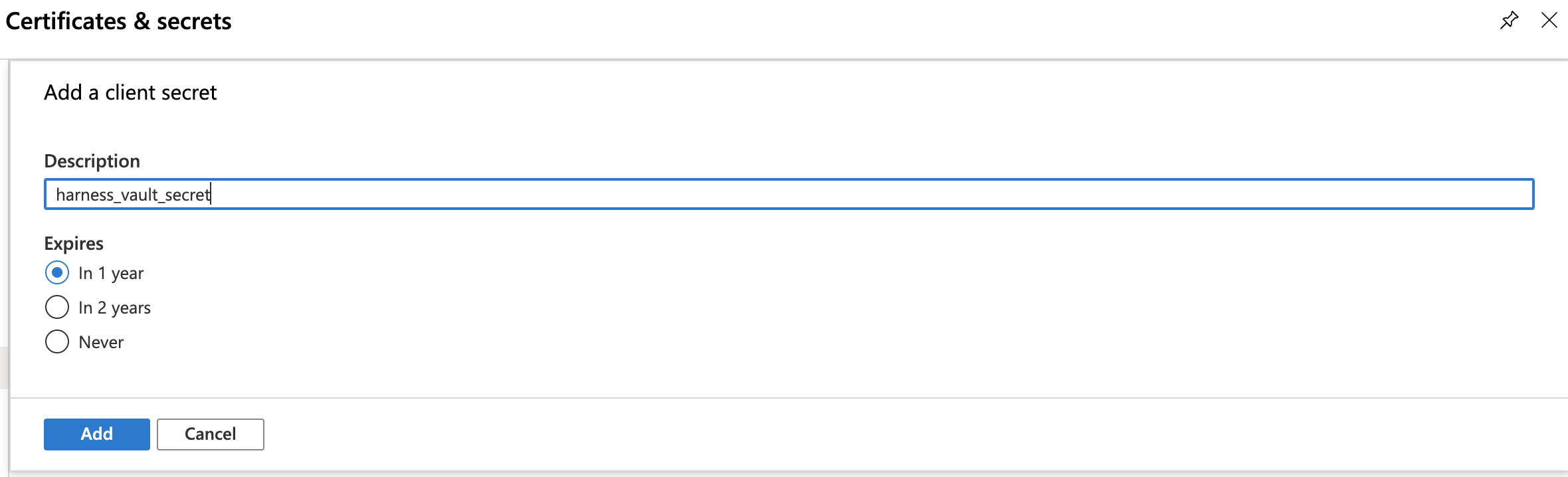 1. Navigate to Azure's Certificates & secrets page. (For details, go to Microsoft Azure's Create a new application secret documentation.)
