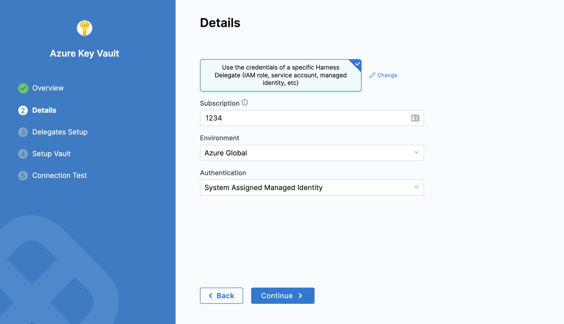 1. Select Use the credentials of a specific Harness Delegate (IAM role, service account, managed identity, etc).